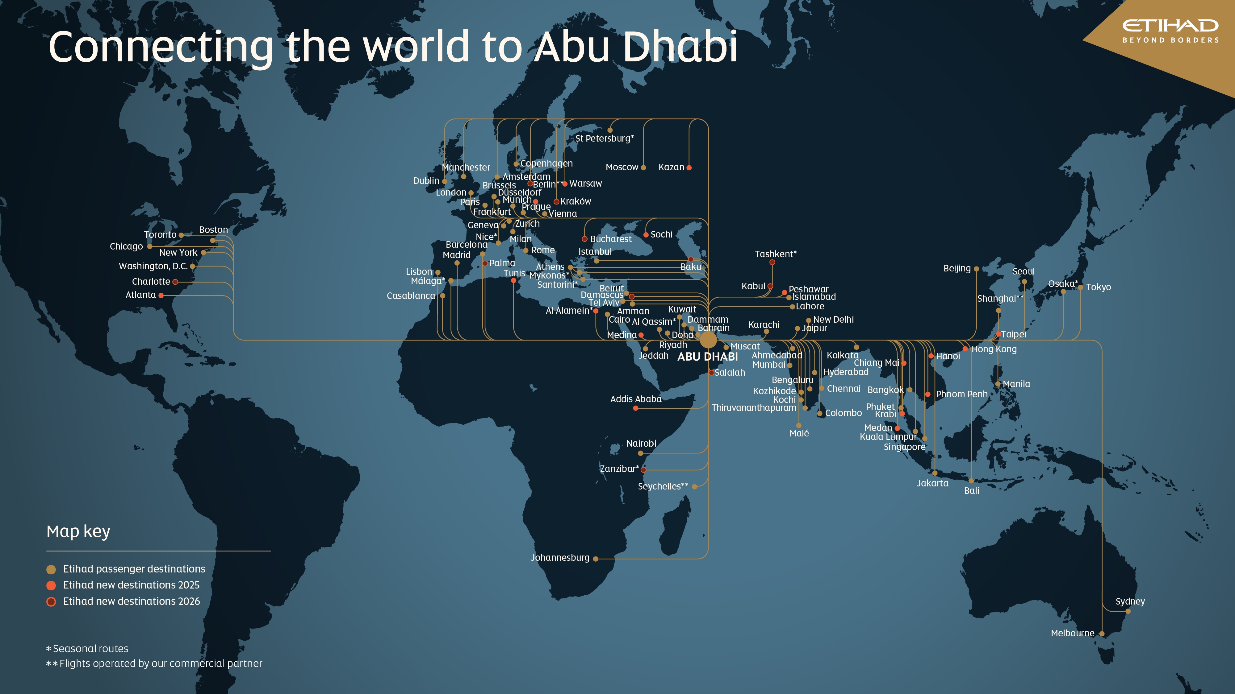 We’ve partnered with airlines around the world to offer an extensive network of destinations and even more convenience. You still keep your Etihad Airways flight number but fly with a different airline for a segment of your journey.