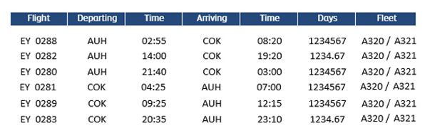 Flight schedule for Abu Dhabi – Kochi service effective 29 October
