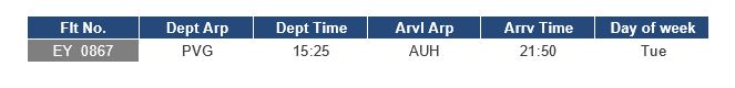 There has been a schedule change for flight EY867 from Shanghai (PVG) to allow greater connectivity from Abu Dhabi.