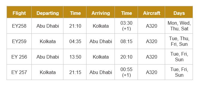 Flight schedule for Abu Dhabi – Kolkata service, effective 26 March 2023: