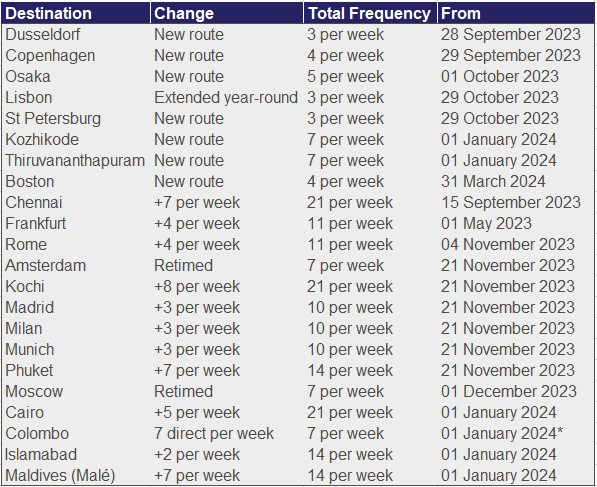 *콜롬보 - 2023년 12월 1일부터 매주 3회 항공편 운항 *말레 – 2023년 12월 1일부터 3회 추가 운항
